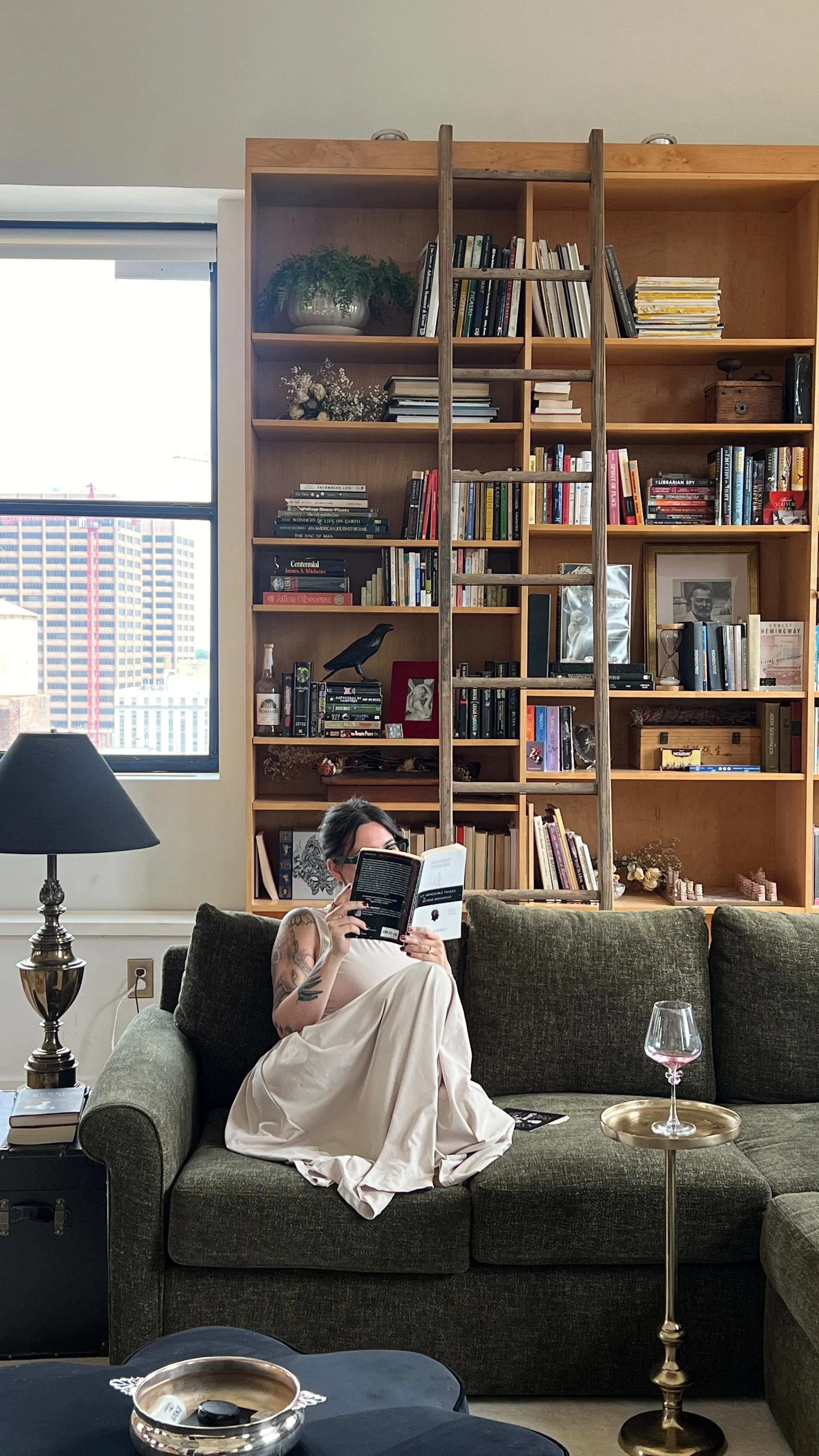 The extra-large bookshelf in the living room grounds the space the perfectly. Not only does it provide ample space for books, but it also creates an ideal backdrop for filming, photo shoots, or intimate conversations, adding a touch of character and charm to any setting.